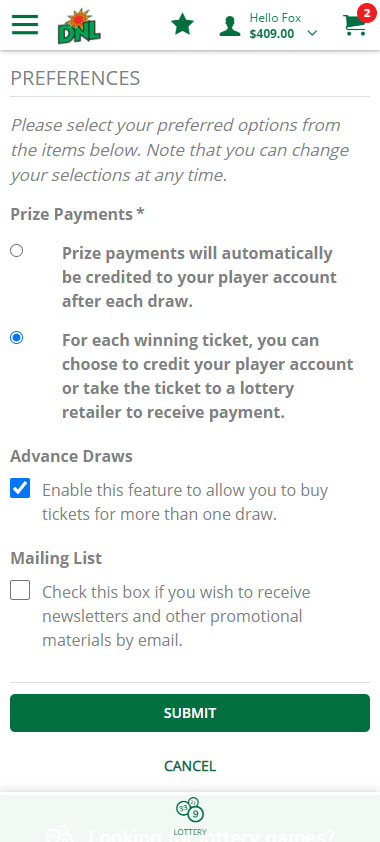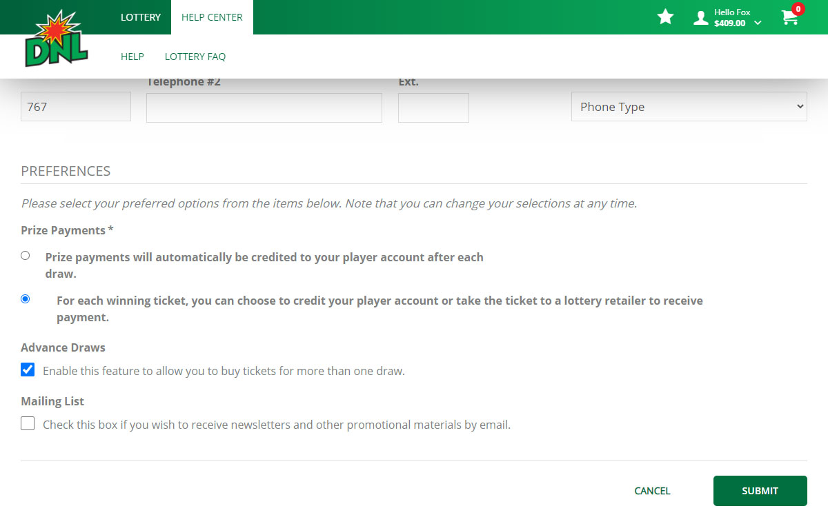 - From this screen you can update your personal information, address, contact information, and prize payment preferences. You can also opt in or out of the mailing list.